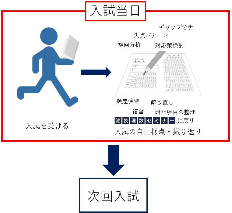 入試を受けて「終わり」ではなく、通常通り(※)振り返りを徹底することで「次の入試にも出て欲しい!!」と思えるまで出題された内容を自分のものにしていきます。もちろん、入試当日以外も入試スケジュールに沿って対策を行っていきます。