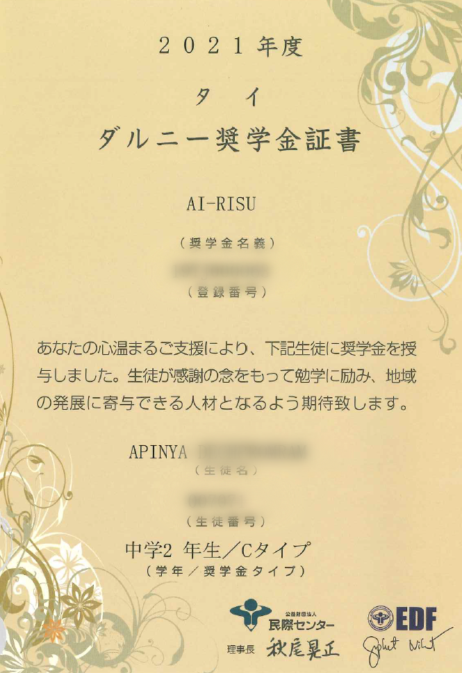 ※現地の奨学生には、支援者の名前として池袋理数セミナー卒業生の会の英名、Alumni of Ikebukuro RISUを略して、「AI-RISU」(読み:アイリス)が伝えられています。